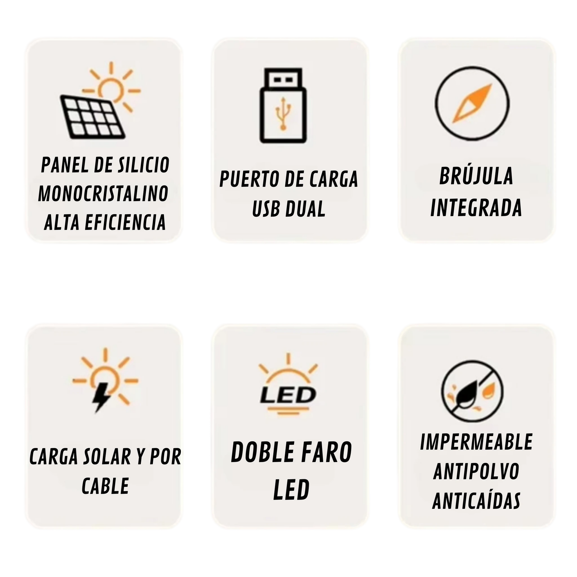 Diseñado para la vida al aire libre, incluye brújula integrada e iluminación LED para orientarte y acompañarte incluso en la oscuridad. Su estructura resistente y sus sistemas de protección de temperatura, sobrecarga y voltaje garantizan seguridad y larga vida útil. No es solo un cargador: es tu compañero de confianza , tu fuente de energía en cualquier momento y tu herramienta imprescindible para vivir sin límites.